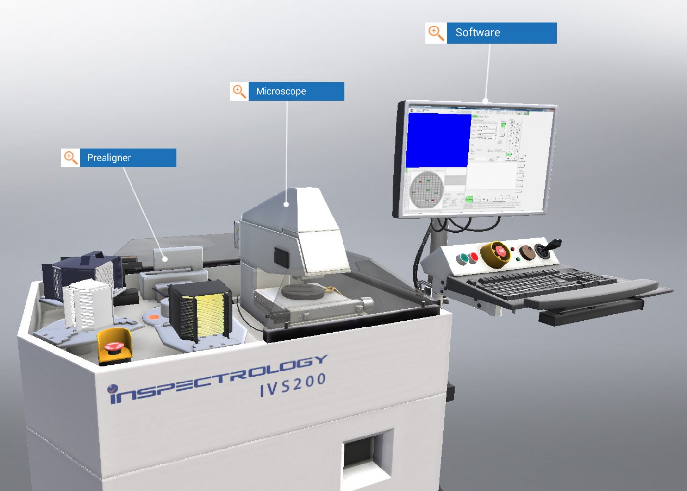 In den 3D-Modellen werden alle vorhandenen Optionen dargestellt, die mit dem System umgesetzt werden können: Automation mit HSMS/GEM-Schnittstellen, Fernzugriff auf IVS-Geräte, Offline-Erstellung von Messvorschriften, automatische Offline-Erstellung von Messvorschriften, optische Zeichenerkennung (OCR), neue, individuell angepasste Messvorlagen.
